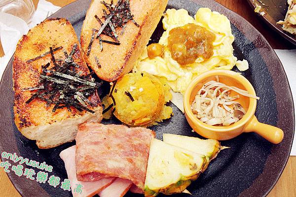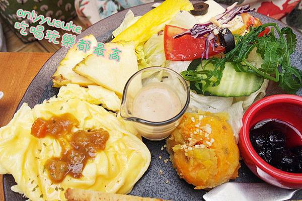 ♡除了主食外,它的擺盤裡還有沙拉跟地瓜泥以及太陽蛋跟自製的果醬